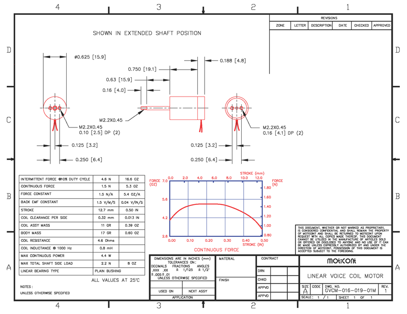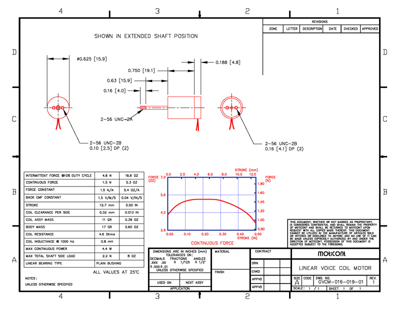 (0.79 in.) beyond the face of the housing. The end of the shaft has an M2.2X0.45 thread by 4.0 mm long for backlash free connections. Non-commutated, these brushless miniature linear servo motors are clean, quiet, and feature high acceleration/deceleration, high speed, high reliability, cog free linear motion. and improved reliability. The housing and coil end of the GVCM-016-019-01MVAC has 2 M2.2X0.45 threaded mounting holes on 6.4 mm centers for easy integration into new and existing applications. |
