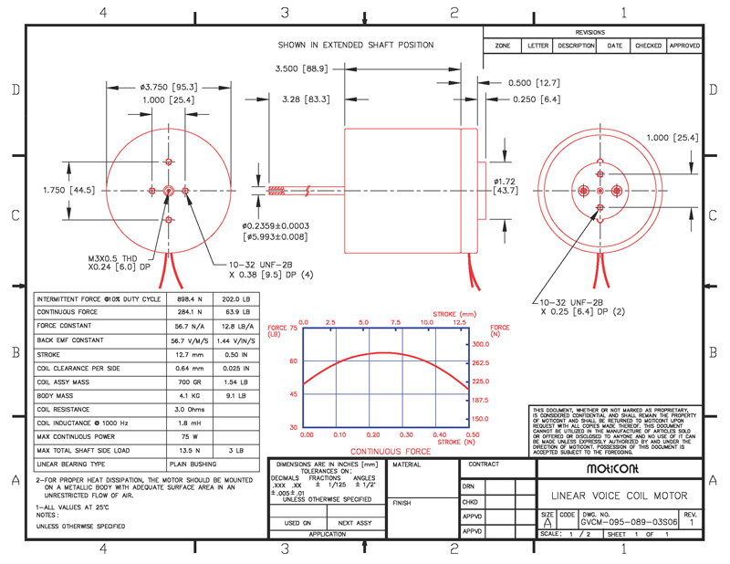 cycle. The motor is guided by a long-life plain bearing that permits side loads up to 3 lb (13.5 N). The precision ground 0.236 inch (6.0 mm) diameter shaft has an internal thread. These are quiet, efficient, smooth, cog-free motion of these low inertia brushless GVCM-095-089 Series Linear Voice Coil Motors. These new voice coil actuators feature: High speed, high acceleration/deceleration, zero backlash, high force to size ratio and high accuracy, and high repeatability when used in a closed loop servo system. |