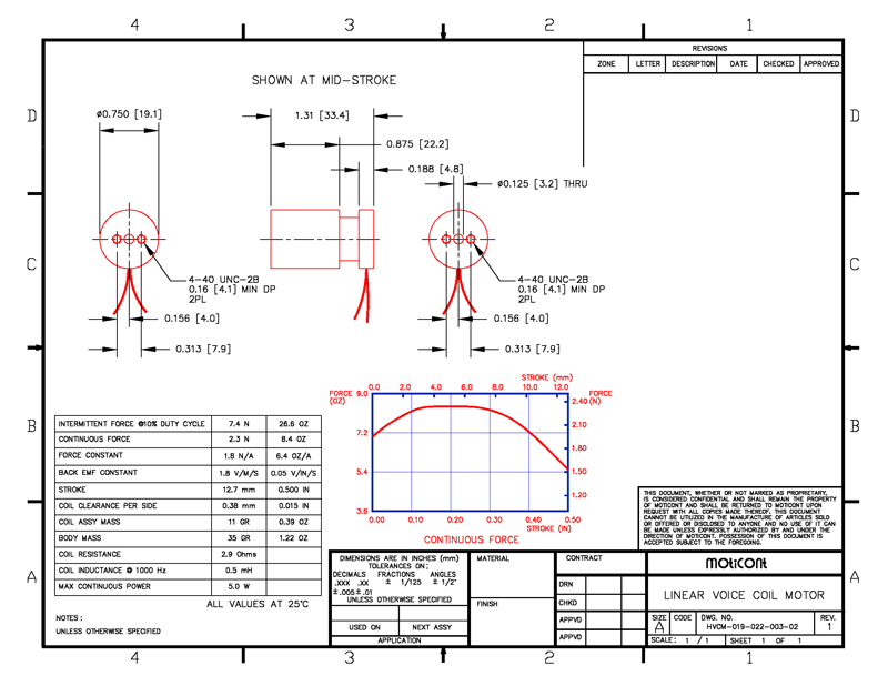 Continuous Force: 8.4 oz (2.3 N), Stroke: 0.500 in (12.7 mm), Aperture: 3.2 mm