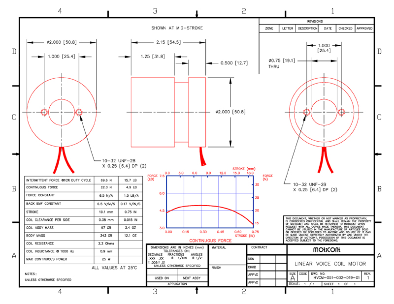 | Imperial Model # | Stroke | Continuous Force | Intermittent Force @ 10% Duty Cycle | Housing Length | Through Hole Dia. | |||||