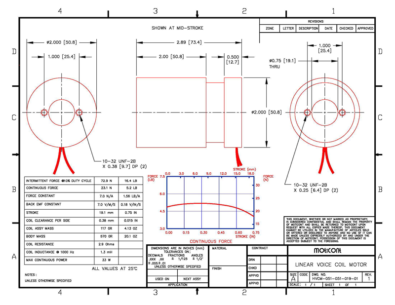 | Model # | Stroke | Continuous Force | Intermittent Force @ 10% Duty Cycle | Housing Length | Through Hole Dia. | |||||