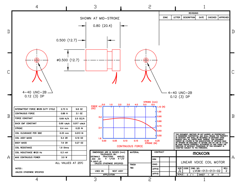 Linear Voice Coil Motor Actuator LVCM-013-013-02VAC, Vacuum Compatible, Continuous Force: 3.1 Oz (0.86 N), Stroke: 0.25 in (6.4 mm)