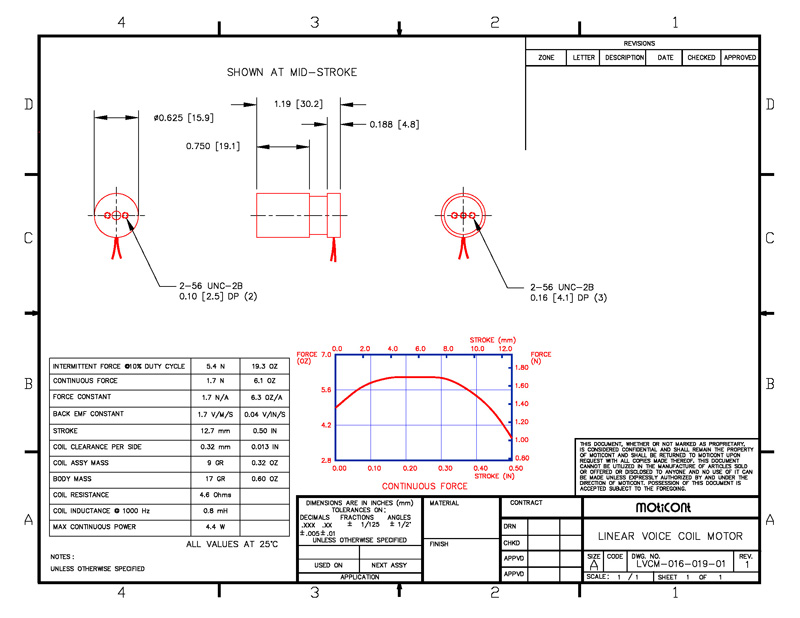 They are only 30.2 mm (1.19 in) long at mid-stroke.  The LVCM-016-019-01MVAC (Metric) Linear Voice Coil Motor has M2.2X0.45 threaded mounting holes on a 6.4 mm (0.250 in.) bolt circle on the housing and the coil ends, and the LVCM-016-019-01VAC has 2-56 UNC-2B threaded holes for easy integration of these linear servo motors into a new or existing application.