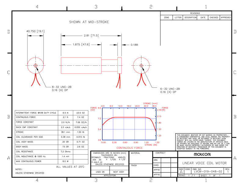 closed position loop. The Voice Coil Motor (also referred to as actuator) is clean, quiet, efficient, brushless high speed linear servo motor. This small LVCM-019-048-02VAC actuator has a 1.500 in (38.1 mm) stroke length , 0.750 in. (19.1 mm) diameter, and a high-force-to-size ratio of 7.4 oz (2.1 N) and a peak force of 23.5 oz. (6.5 N) at 10% duty cycle. This efficient, low inertia, high acceleration, brushless, high speed linear motor has zero cogging and features high accuracy, and high repeatability. The motor features an 8-32 UNC-2B threaded mounting hole in the center of the housing and on the coil end to easily integrate into new or existing applications. |