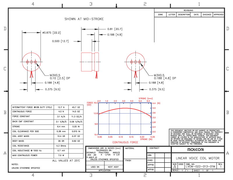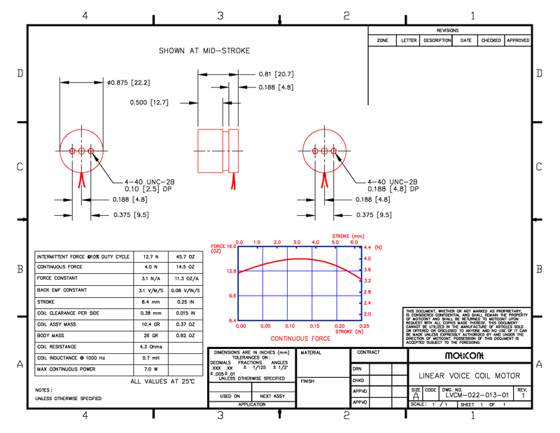 The miniature LVCM-022-013-01MVAC Linear Voice Coil Actuator has 22.2 mm (0.875 in.) in diameter and at mid-stroke just 20.7 mm (0.81 in.) long, this metric miniature voice coil actuator has a continuous force of 4.0 N (14.5 oz) and a peak force of 12.7 N (45.7 oz), and features a 6.4 mm (0.25 in.) stroke.