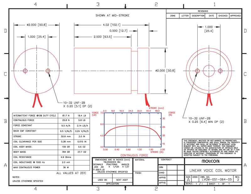 Linear Voice Coil Motor Actuator LVCM-051-064-05VAC, Vacuum Compatible, Continuous Force: 5.8 lb (25.8 N), Stroke: 2.00 in (50.8 mm)