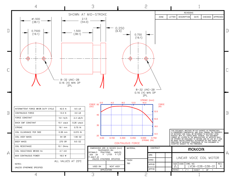 Linear Voice Coil Motor Actuator LVCM-038-038-01VAC, Vacuum Compatible, Continuous Force: 3.0 lb (13.4 N), Stroke: 0.75 in (19.1 mm)